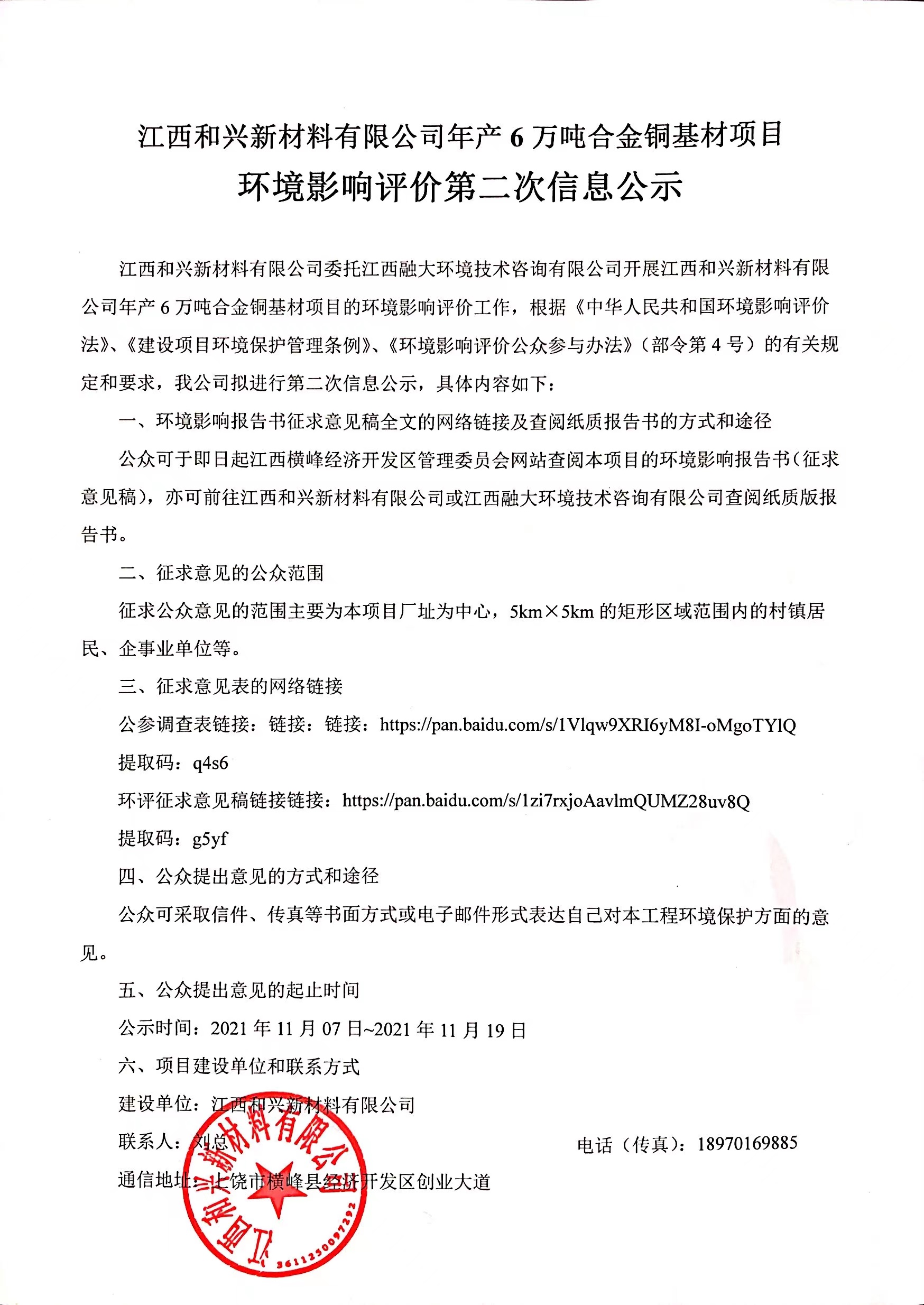 江西和興新材料有限公司年產6萬噸合金銅基材項目環境影響評價第二次信息公示