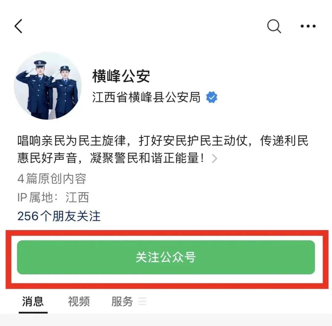 (1)使用微信搜索“橫峰公安”公眾號,關注后進入。