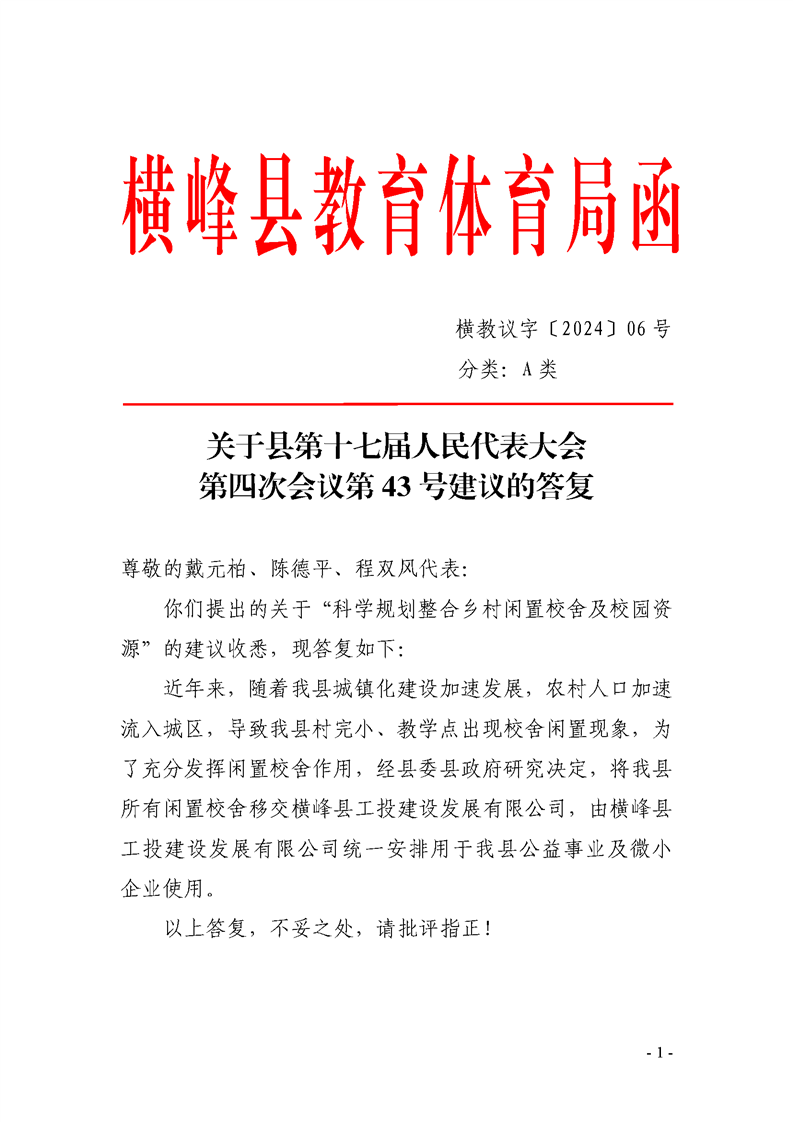 關(guān)于縣第十七屆人民代表大會(huì)第四次會(huì)議第43號(hào)建議的答復(fù)
