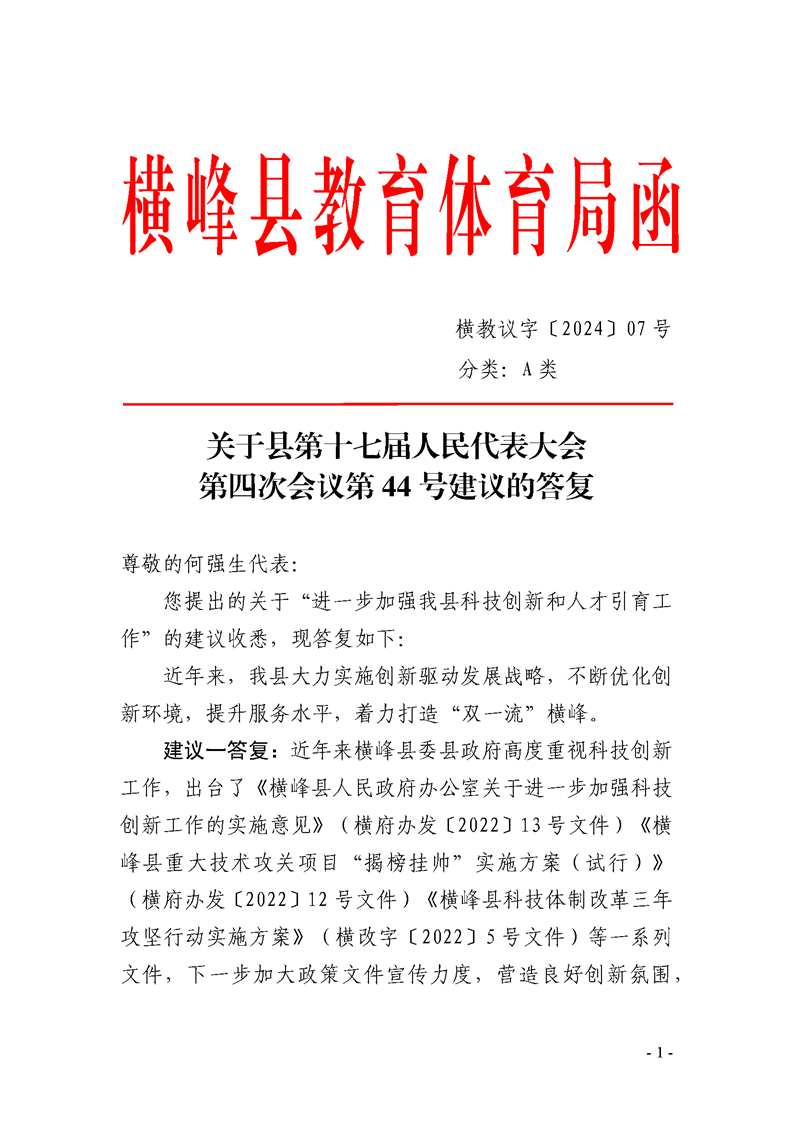 關于縣第十七屆人民代表大會第四次會議第44號建議的答復