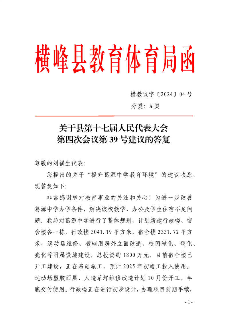 關(guān)于縣第十七屆人民代表大會第四次會議第39號建議的答復(fù)