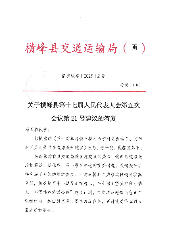 關于橫峰縣第十七屆人民代表大會第五次會議第21號建議的答復