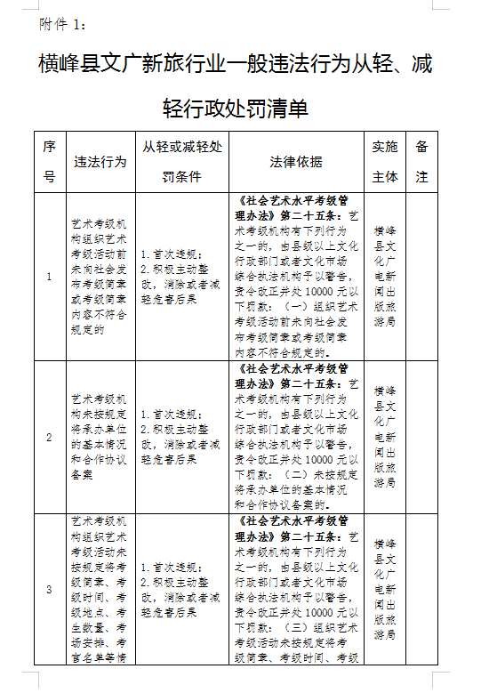 附件:1.橫峰縣文廣新旅行業一般違法行為從輕、減輕行政處罰清單。