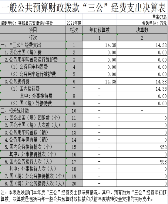 (二)公務接待費支出年初預算數為14.38萬元,決算數為14.38萬元,完成預算的100 %,決算數較2020年減少0.01萬元,下降0.07% ,主要原因是厲行節約精神,嚴控“三公”經費支出。決算數較年初預算數減少的主要原因是:厲行節約精神,嚴控“三公”經費支出。全年國內公務接待958批,累計接待958人次,其中外事接待0批,累計接待0人次,主要為:厲行節約精神,嚴控“三公”經費支出。