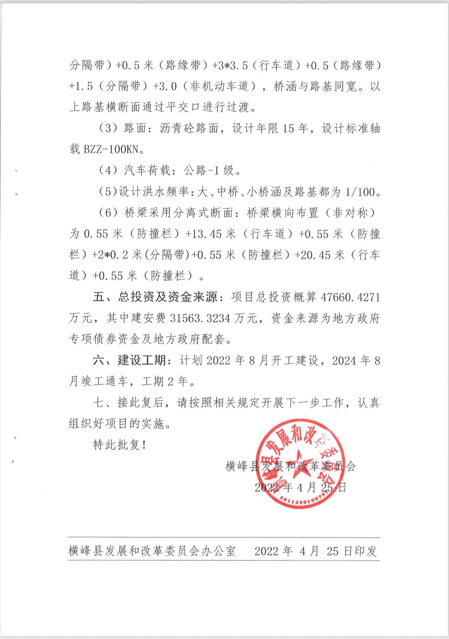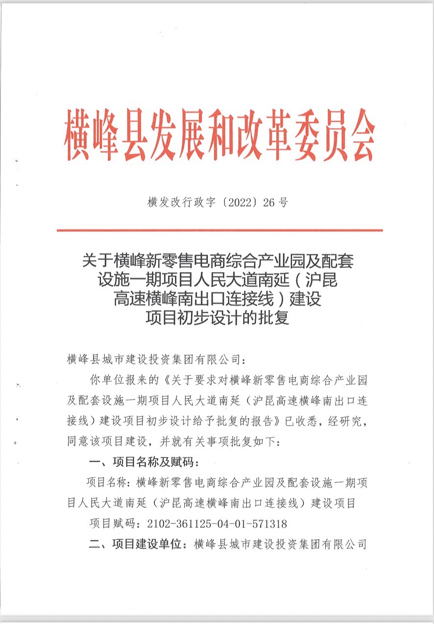 關于橫峰新零售電商綜合產業園及配套設施一期項目人民大道南延(滬昆高速橫峰南出口連接線)建設項目初步設計的批復