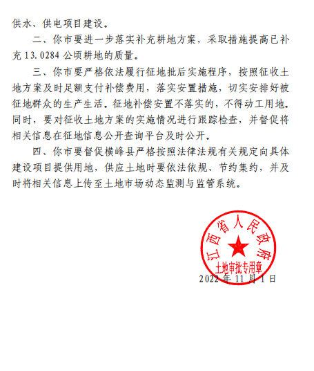 江西省人民政府關(guān)于橫峰縣 2022 年度第 1 批次城市建設用地的批復