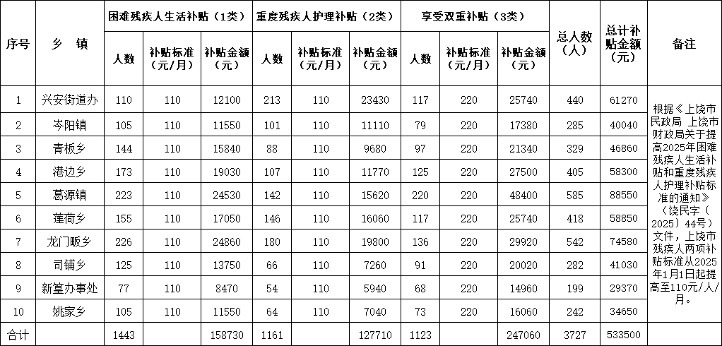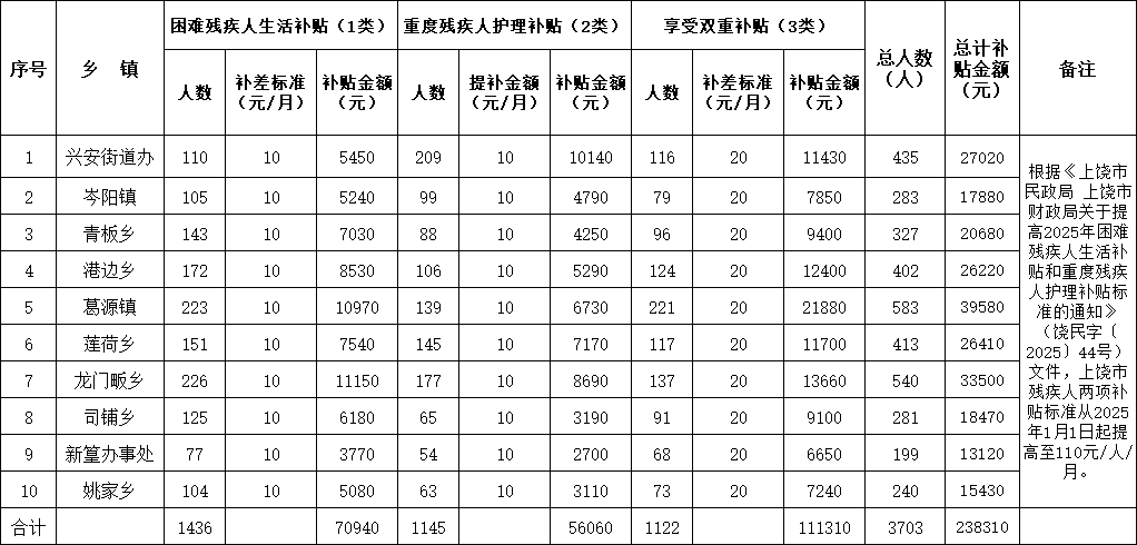 橫峰縣2025年6月份殘疾人兩項補貼發放情況匯總表