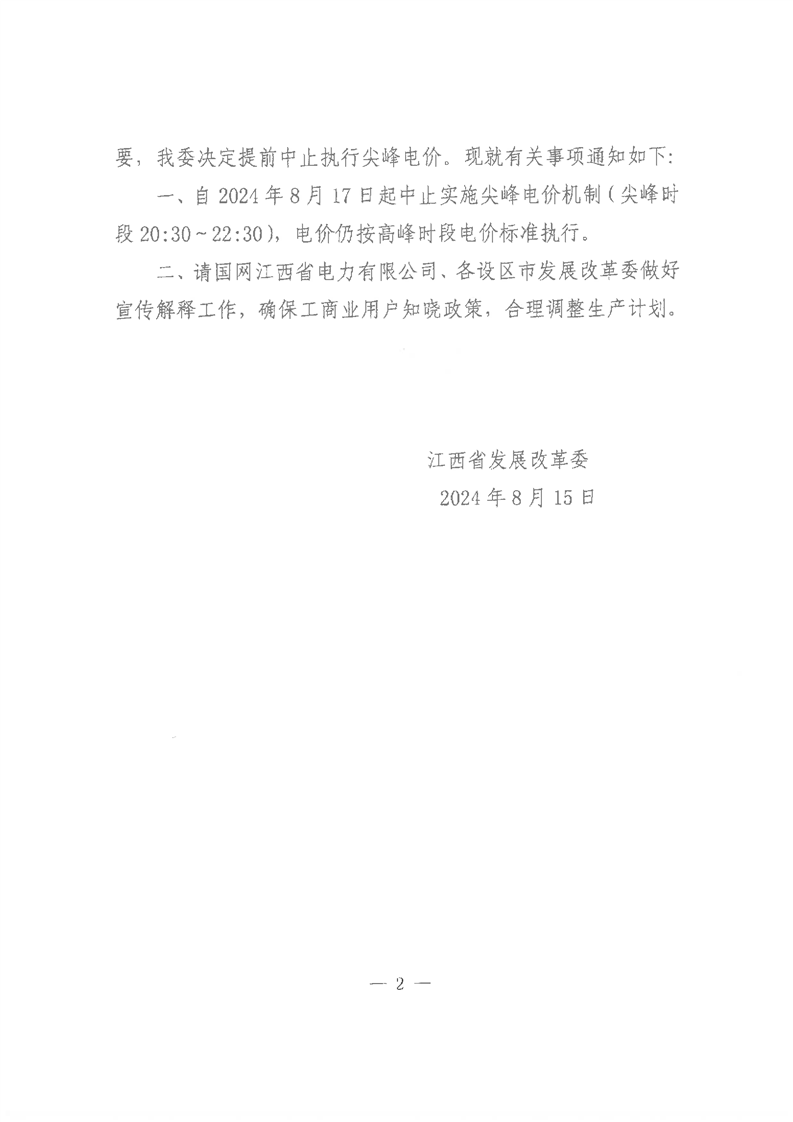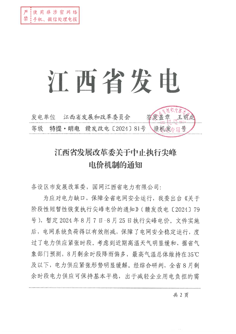 贛發改電【2024】81號《江西省發展改革委關于中止執行尖峰電價機制的通知》