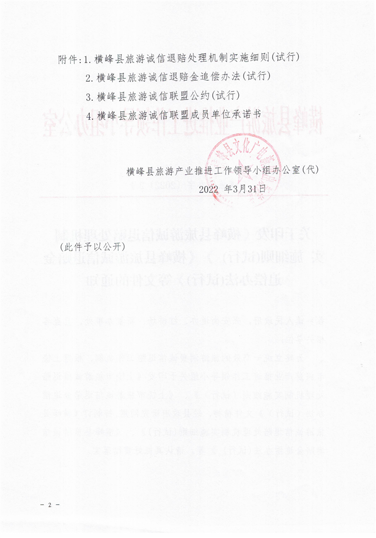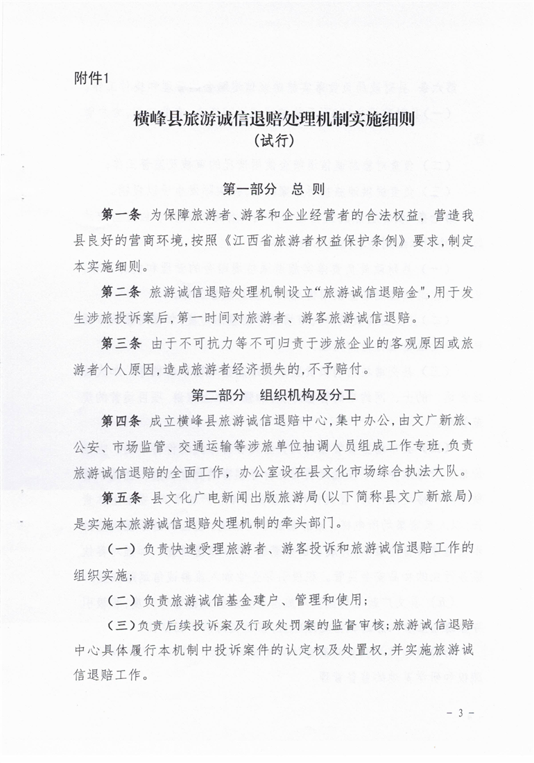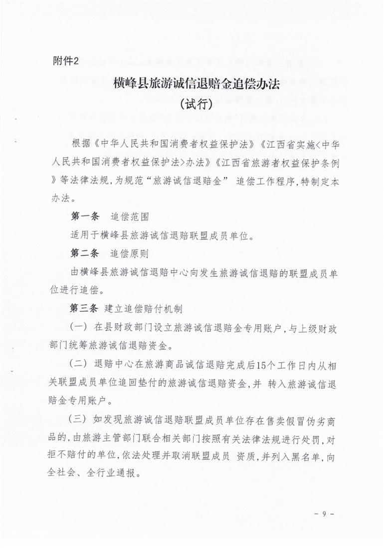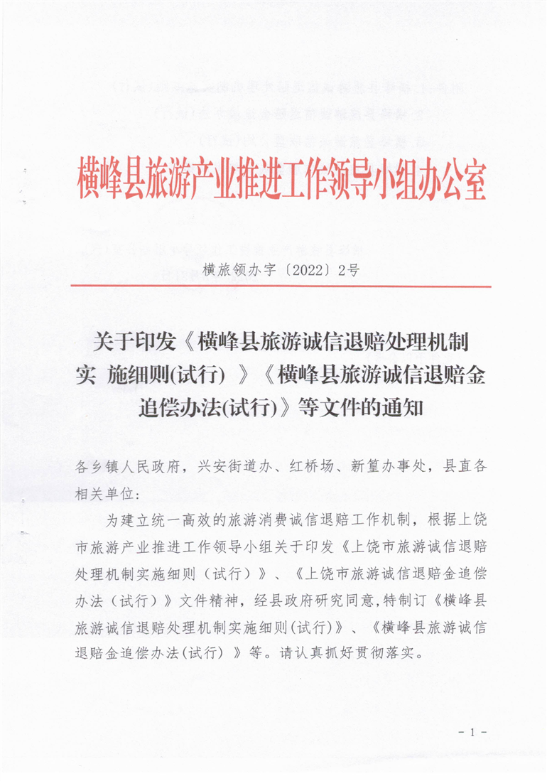 關于印發《橫峰縣旅游誠信退賠處理機制實施細則(試行)》