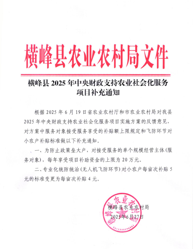 橫峰縣2025年中央財政支持農業社會化服務項目補充通知