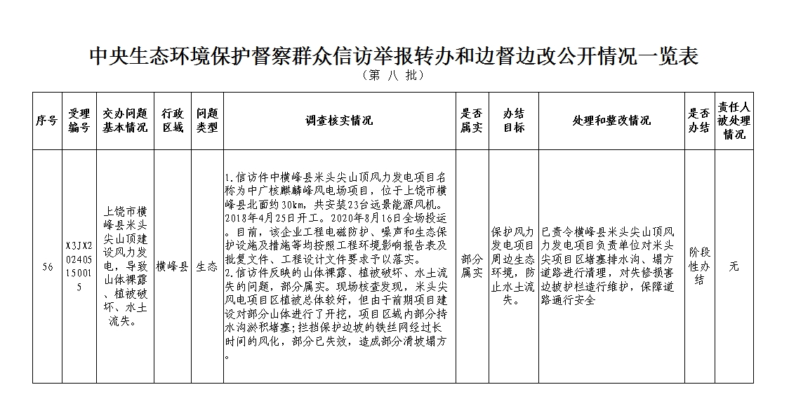 截至5月25日,對(duì)中央第三生態(tài)環(huán)境保護(hù)督察組向橫峰縣移交的第八批群眾信訪舉報(bào)件1件,各責(zé)任單位均按要求上報(bào)調(diào)查處理情況。根據(jù)督察要求,群眾信訪舉報(bào)轉(zhuǎn)辦和邊督邊改公開(kāi)情況一覽表將在報(bào)紙、網(wǎng)站等媒體上公布。