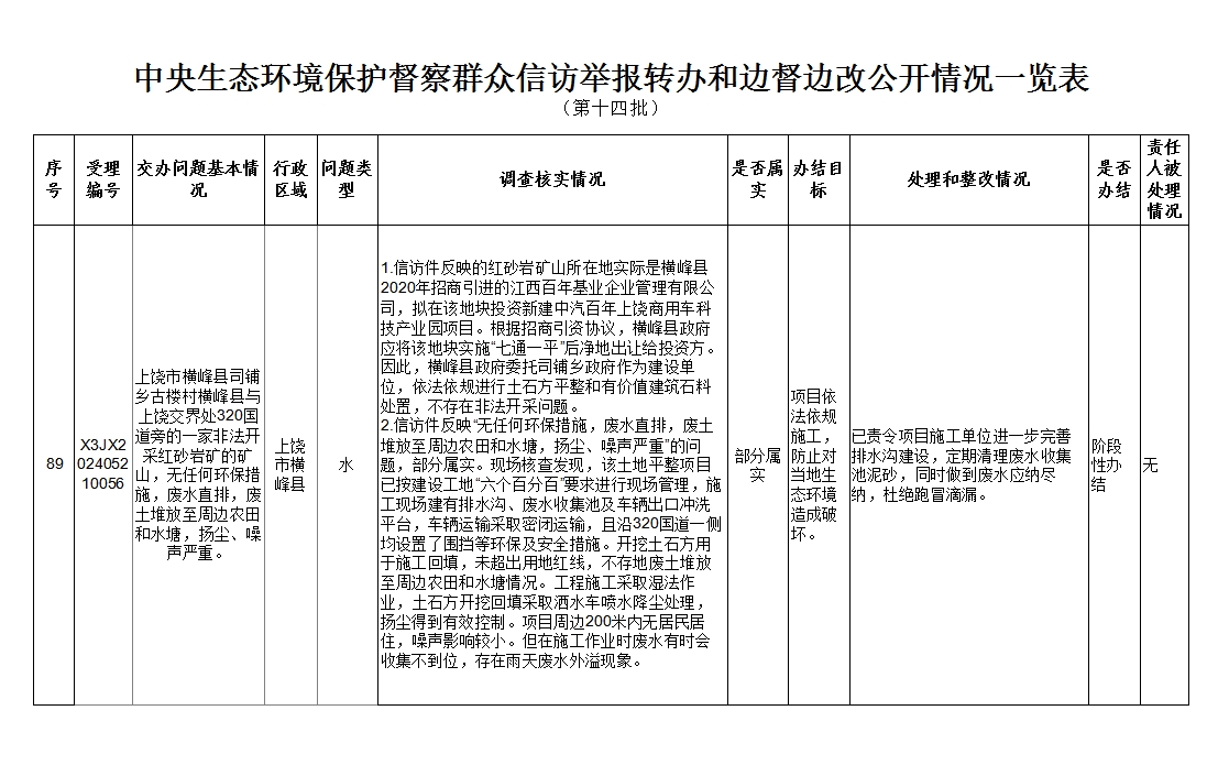 截至5月31日,對中央第三生態環境保護督察組向橫峰縣移交的第十四批群眾信訪舉報件1件,各責任單位均按要求上報調查處理情況。根據督察要求,群眾信訪舉報轉辦和邊督邊改公開情況一覽表將在報紙、網站等媒體上公布。