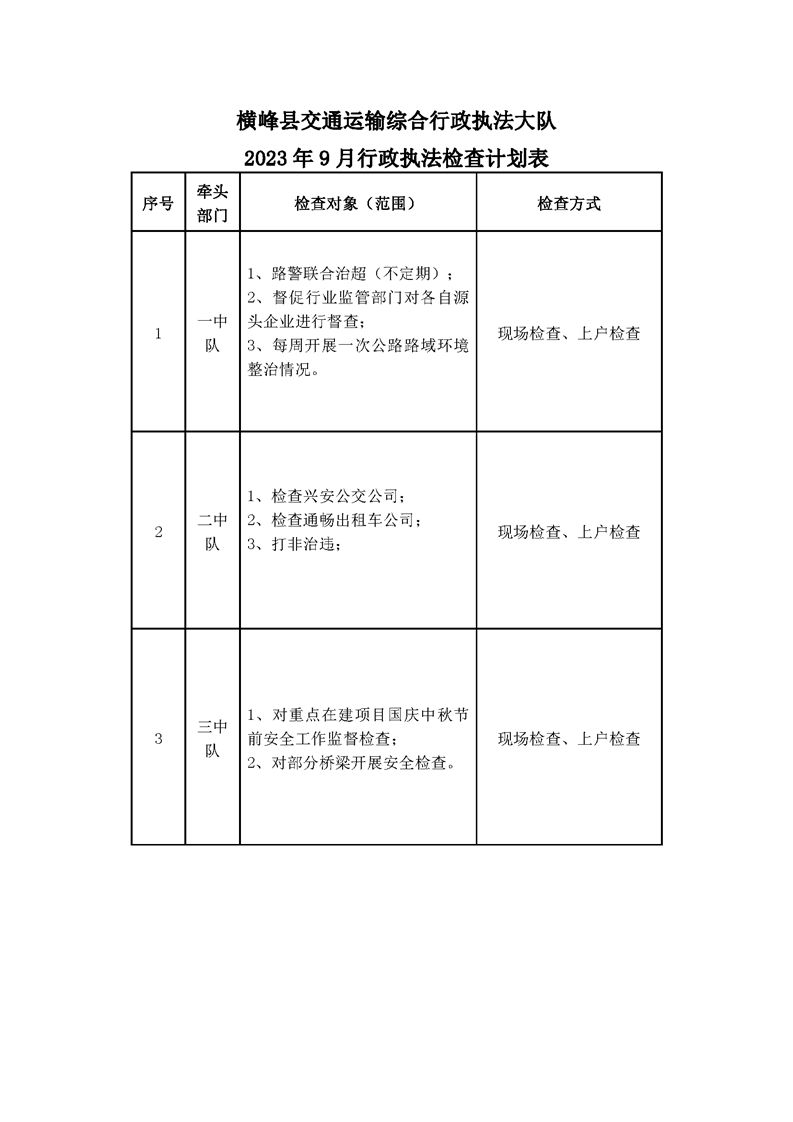 橫峰縣交通運輸綜合行政執法大隊2023 年 9 月行政執法檢查計劃表