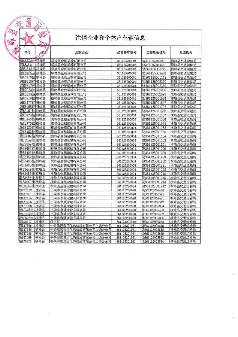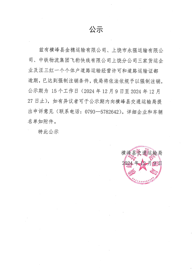 橫峰縣貨運企業(yè)道路運輸經(jīng)許可逾期注銷公示