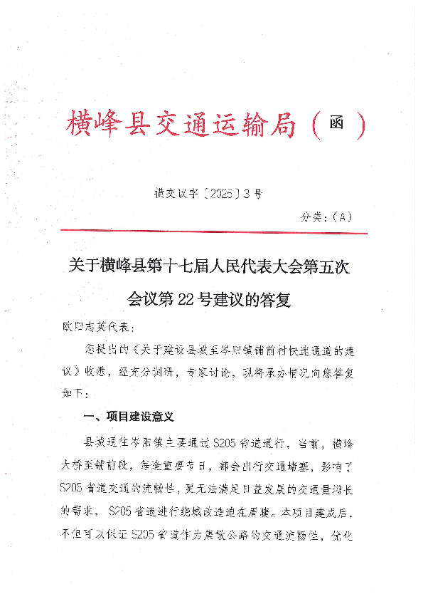 關(guān)于橫峰縣第十七屆人民代表大會(huì)第五次會(huì)議第22號(hào)建議的答復(fù)