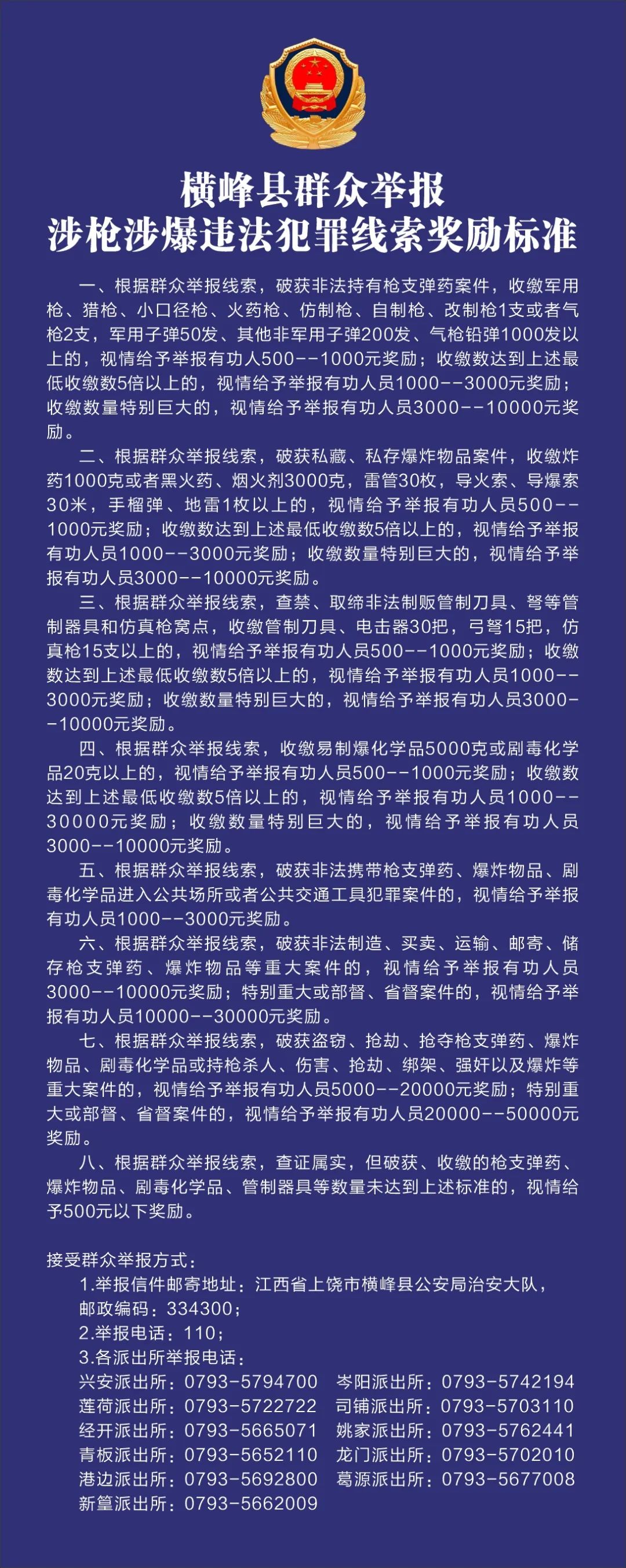 橫峰縣群眾舉報涉槍涉爆違法犯罪線索獎勵標準