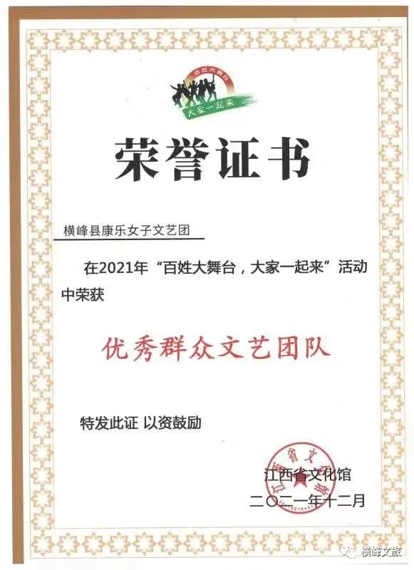 為充分發揮我省“百姓大舞臺·大家一起來”大型公益性文化活動品牌的示范引領作用,進一步豐富基層群眾文化活動,活躍群眾精神文化生活,穩步推進文化惠民工程,有效提升公共文化服務效能,推動基層公共文化服務高質量發展,江西省文化館組織開展了2021年度“百姓大舞臺·大家一起來”評先工作。經專家評審,我縣康樂女子文藝團獲評2021年度“百姓大舞臺·大家一起來”優秀群眾文藝團隊。