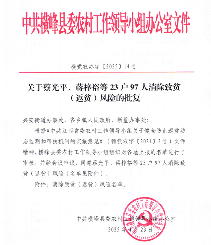 關于蔡光平、蔣梓裕等23戶97人消除致貧(返貧)風險的批復