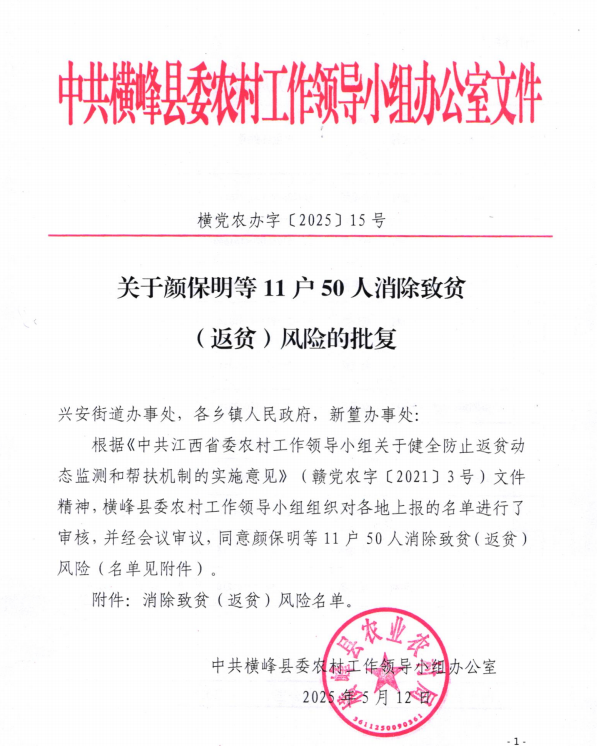 關(guān)于顏保明等11戶50人消除致貧(返貧)風(fēng)險(xiǎn)的批復(fù)