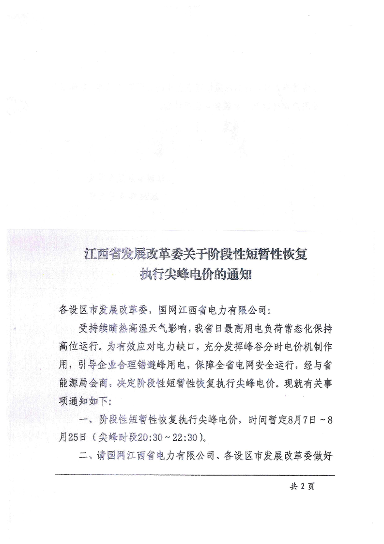(轉發)江西發展改革委關于階段性短暫性恢復執行尖峰電價的通知