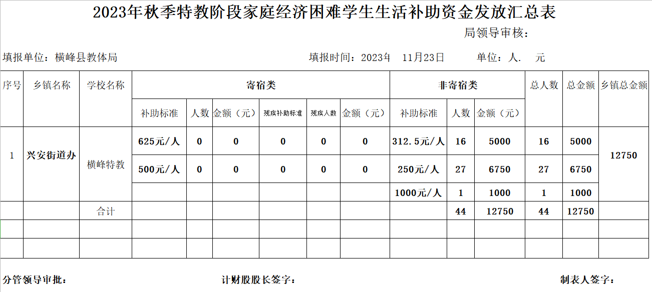 2023年秋季特教階段家庭經濟困難學生生活補助資金發放匯總表